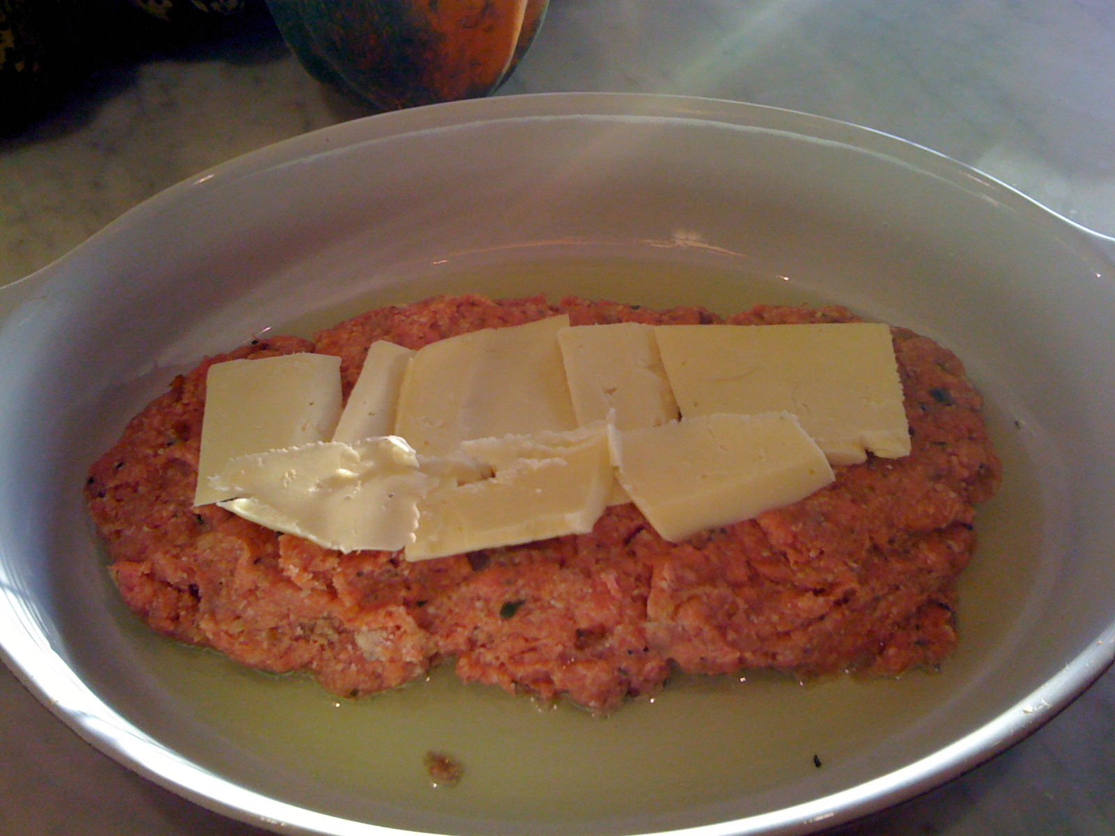 Once the oil is hot, form the bottom layer of your meatloaf in the heated oil and add sliced CHEDDAR CHEESE before you put your top layer on.