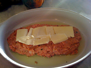 In our family meatloaf is basically a giant meatball baked in the oven with a surprise in the middle. The surprise that my Nana put in the middle were a couple of hard-boiled eggs. This remains a great mystery to me. As a kid, I would surgically remove the hard boiled eggs. I found them completely unnecessary and their texture and taste not quite right. I am BUMMED for never asking my Nana why she added the eggs. And my Mom doesn't really know why, she just knows "that's how it was done!" Not quite the anwer I was expecting. So, I have eliminated the eggs but added my own surprise. Other than that, this is our meatloaf recipe: