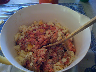 Mix the meat, eggs, salt, pepper, parsley, grated cheese and soaked roll together until well blended.