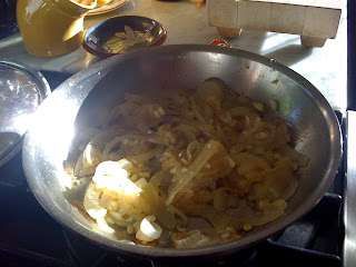 Caramelize the onions in 2 Tbsp olive oil. This takes about 20 + minutes. Add the minced garlic at the end so it doesn't get burned but cooks enough to get aromatic and soft.